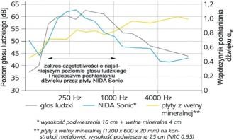 Charakterystyka pochłaniania dźwięku płyt NIDA Sonic pokrywa się z widmem natężenia głosu ludzkiego w funkcji częstotliwości (poniższy wykres). Oznacza to, że płyty te idealnie tłumią hałas pochodzący od głosu ludzkiego jednocześnie redukując zjawisko pogłosu - odbicia dźwięku. Poziom pochłaniania dźwięku okładziny wykonanej przy użyciu płyt NIDA Sonic jest różny w zależności od rodzaju płyty (różne współczynniki pochłaniania dźwięku αw), oraz od wysokości podwieszenia okładziny i grubości zastosowanej wełny mineralnej.